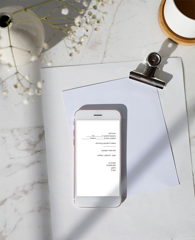 יצרנו מערכת ניהול נוחה להזמין את האורחים שלכם לאירוע. באמצעות השירות אתם יכולים ליצור הזמנה דיגיטלית ואישורי הגעה בדרך קלה ונעימה הכוללת גם אופציה של הוספת אירוע ליומן והוראות ניווט למקום האירוע.